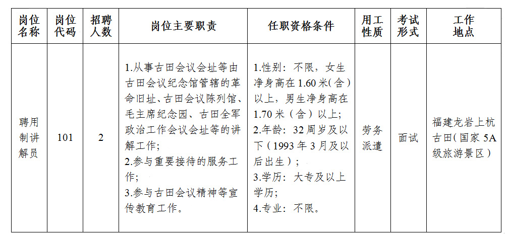 1.工作地点:古田会议纪念馆(位于福建省龙岩市上杭县古田镇、国家5A级景区内)。